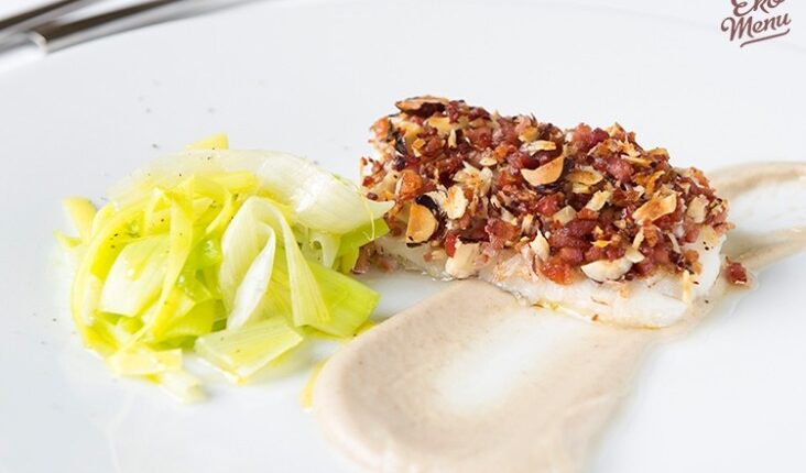 Kabeljauwfilet met een crumble van hazelnoten en spekjes